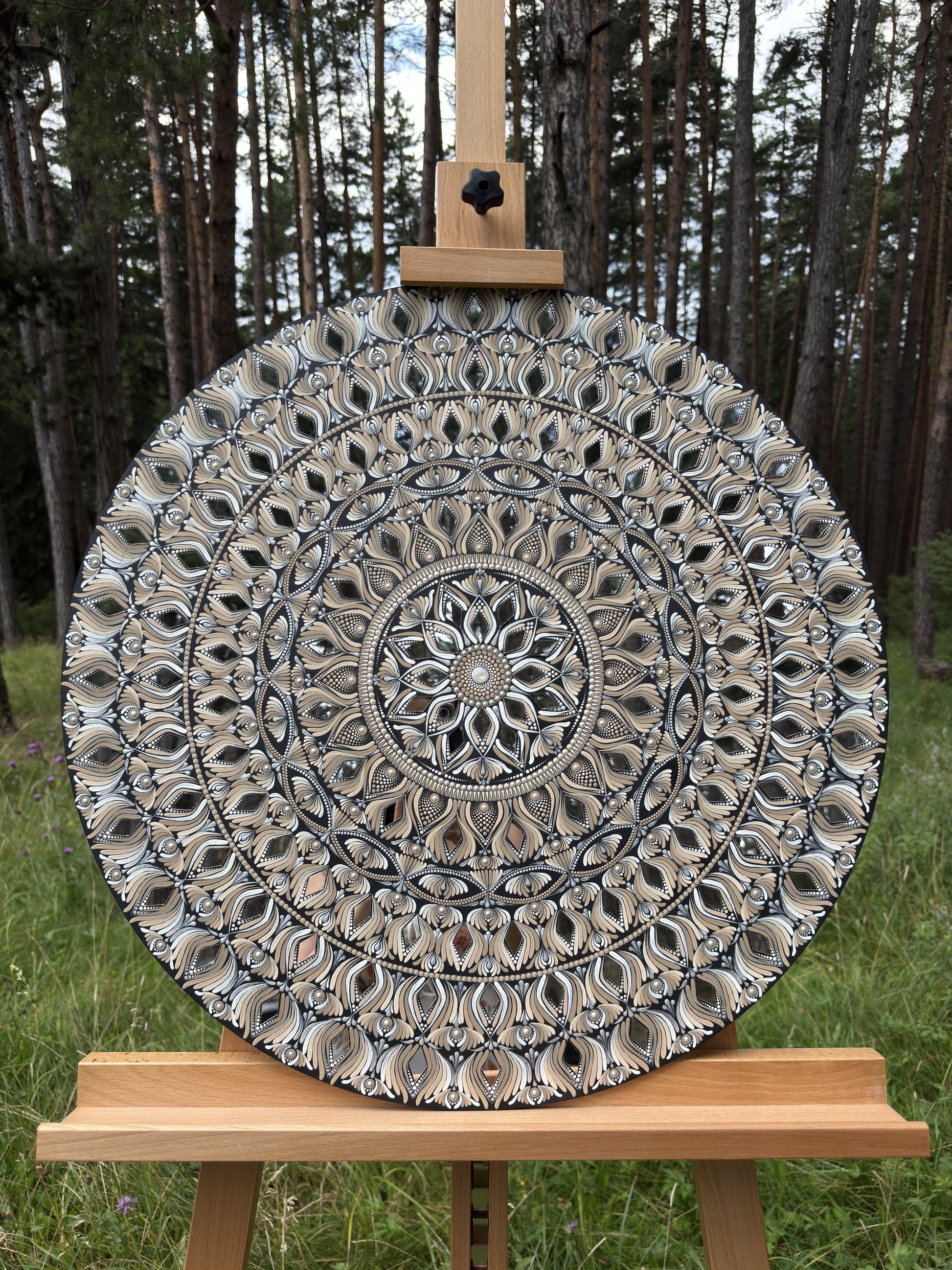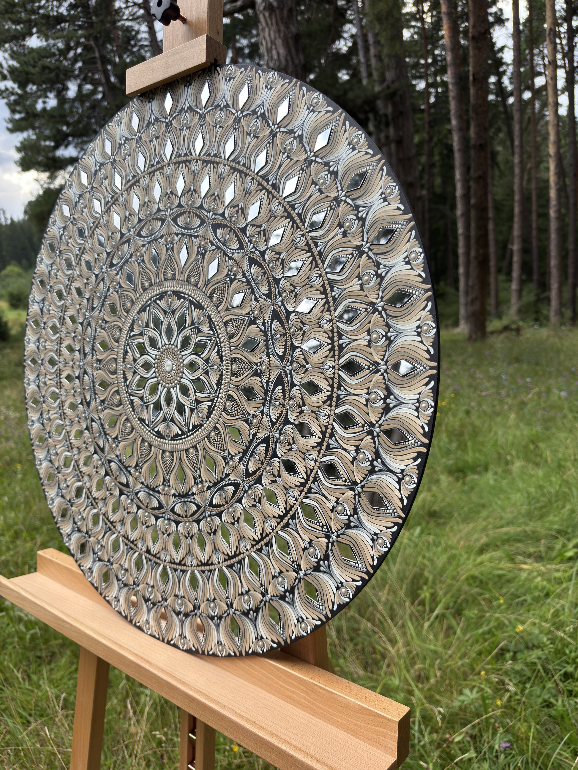 Inner Radiance is an original, hand-painted mandala created dot by dot in the sacred art of pointillism. With its soft tones of white, cream, and beige, this unique piece embodies purity, harmony, and spiritual clarity. Each delicate layer expands like waves of light, reminding us that true strength shines from within. A one-of-a-kind artwork, it carries the gentle power of balance and calm, designed to be your sacred talisman of inner peace and luminous guidance.
