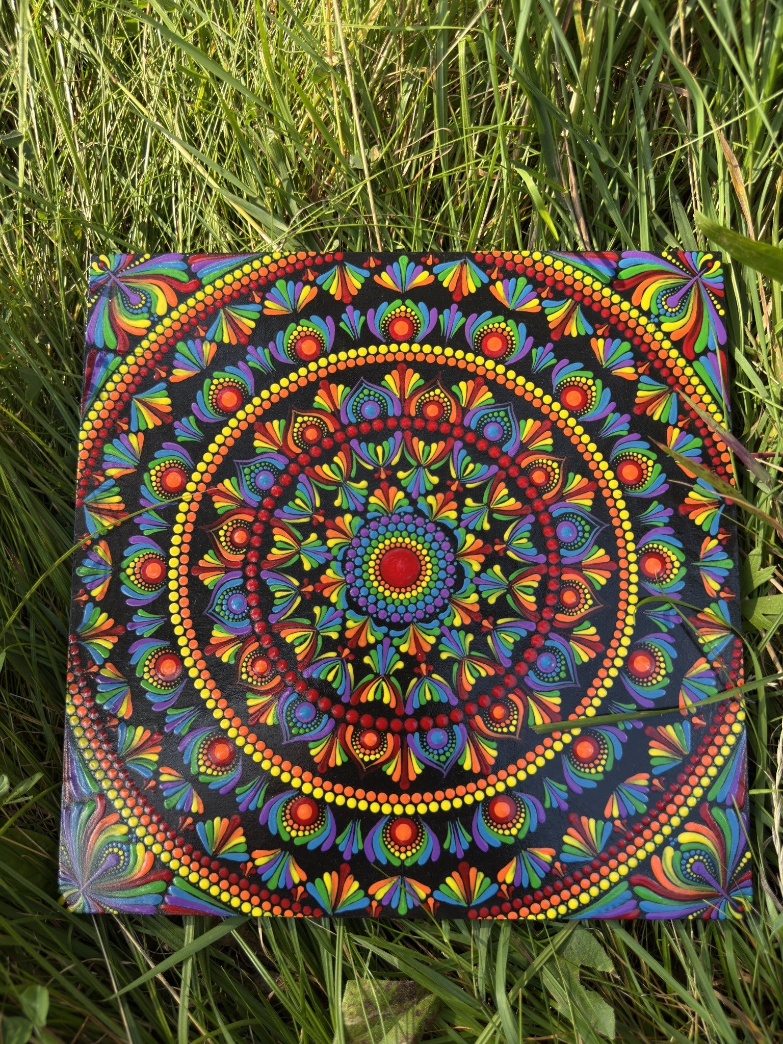 Kaleidoscope Dream is an original hand-painted mandala alive with the full spectrum of the rainbow. Turquoise, violet, gold, and every shade in between ripple outward in radiant harmony, creating the illusion of constant movement. Its geometric flow recalls the hypnotic beauty of a kaleidoscope, pulling the viewer into a dance of infinite reflections.